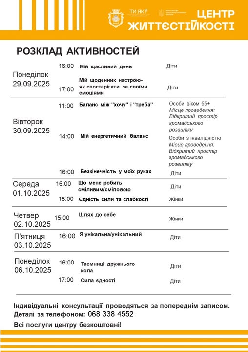 З 29 вересня по 6 жовтня Центр життєстійкості пропонує насичену програму цікавих і корисних зустрічей для різних вікових категорій та потреб. Протягом тижня діти зможуть долучитися до тренінгів із розвитку емоційної грамотності та самопізнання, жінки — до занять із підтримки внутрішньої сили, а люди віком 55+ та особи з інвалідністю — до програм, що допомагають знаходити баланс і енергію в повсякденному житті.
