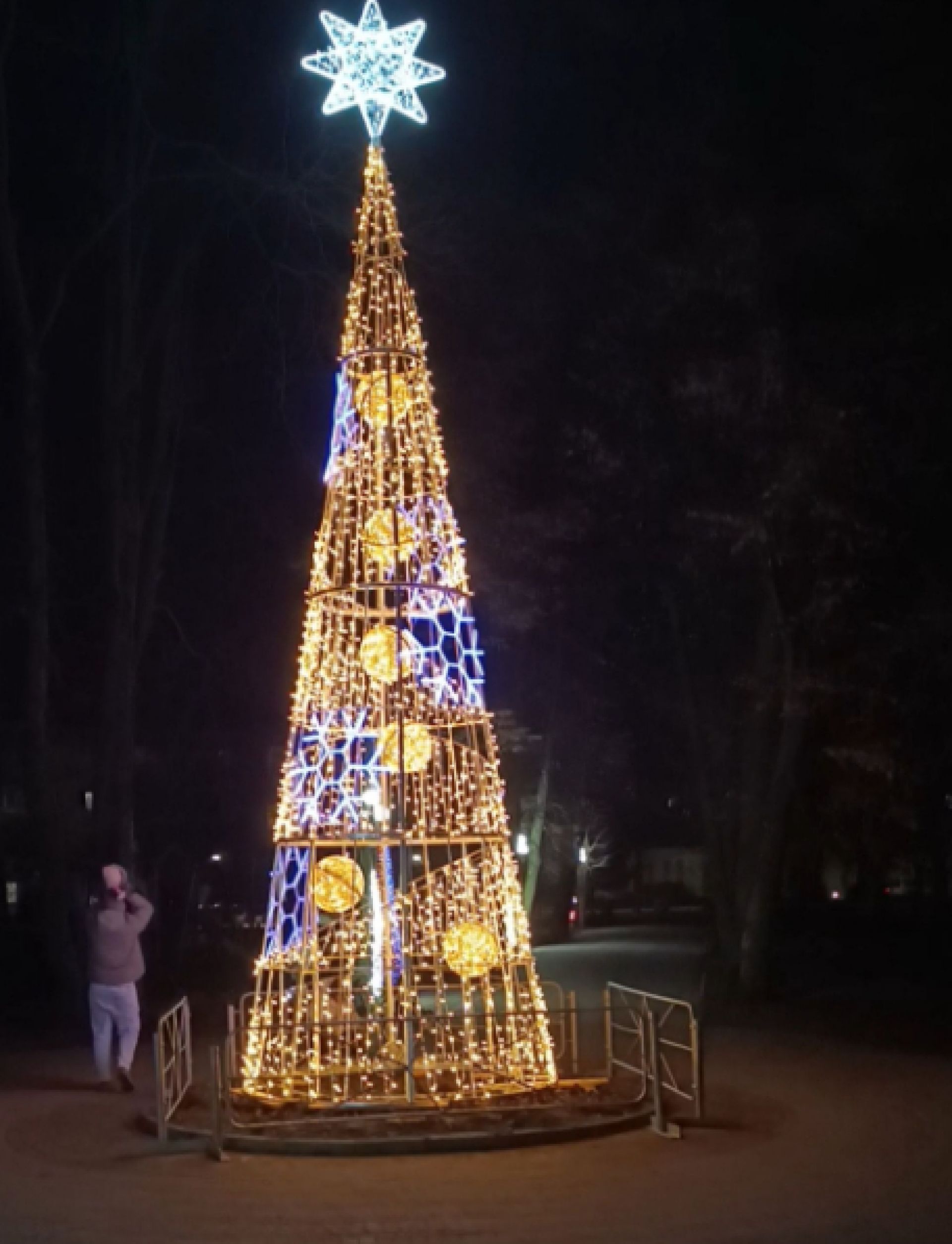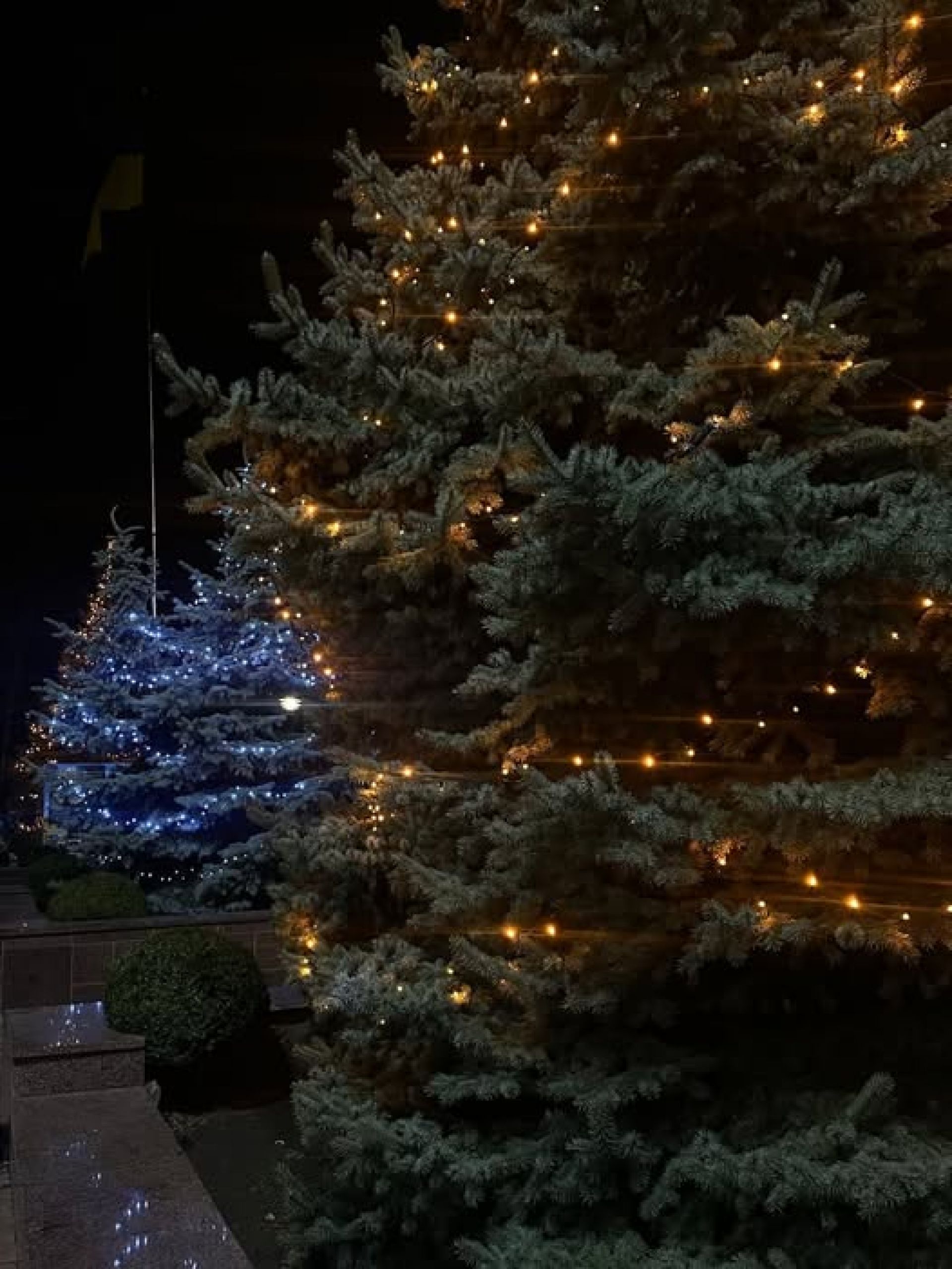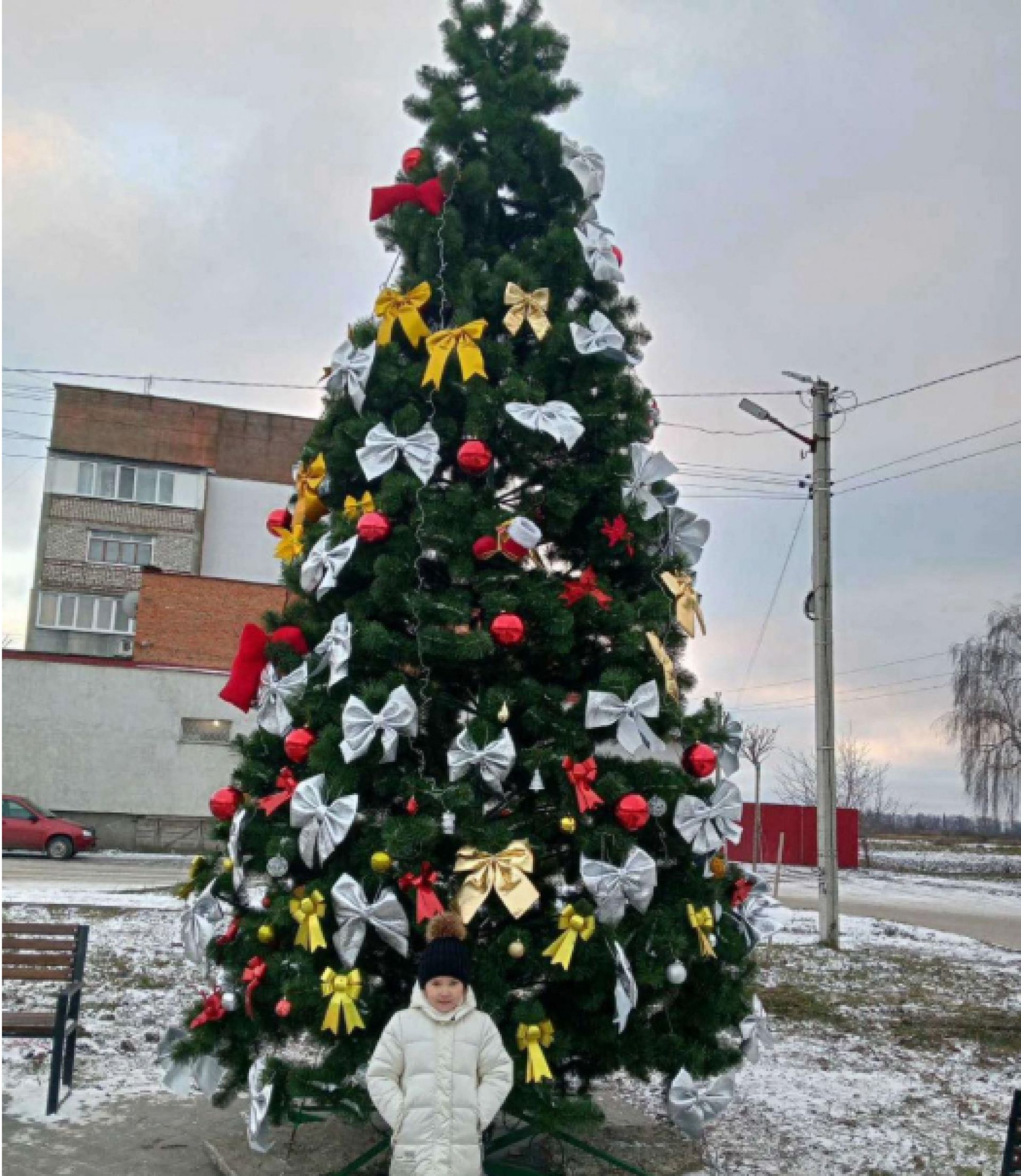 Козятин цьогоріч облаштував дві ялинки: одну у Різдвяному містечку в сквері з металевою конусоподібною конструкцією, іншу – біля училища з різнокольоровими бантиками.