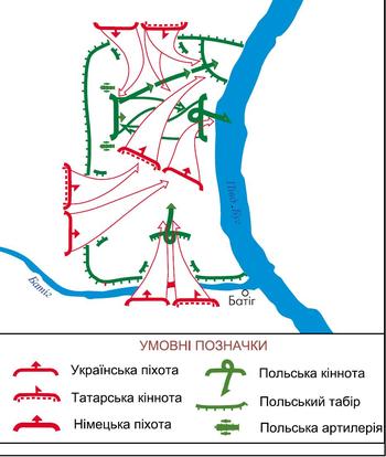 Хмельницький, імітуючи свій від’їзд на весілля, приспав пильність Калиновського. 22 травня (1 червня) козацькі війська і татарські загони переправилися через Буг, непомітно підійшовши до польського табору і на світанку Б. Хмельницький вдарив спочатку по польській сторожі, що стояла вище Ладижина (7 тисяч чоловік), а потім – на все коронне військо, яке не очікувало нападу і перш ніж оговтатись, втратило декілька тисяч. Отямившись, поляки вигнали Б. Хмельницького з табору та почали переслідувати його війська, що і потрібно було гетьману. Як тільки поляки покинули табір, до обозу увірвалась 40-тисячна орда Карач-мурзи, яка поглинула його, за винятком восьми піхотних підрозділів, що замкнулись в “обозовому куті” понад самим Бугом, навіть без гармат. Карач-мурза залишив частину військ для їх оточення, а сам швидко рушив наздоганяти поляків, що переслідували Б. Хмельницького. Такий маневр став не очікуваним для поляків – “…вони впали у відчай і розпач і, показавши плечі Хмельницькому, кинулися назустріч Карач-мурзі, прагнучи пробитися крізь татар до свого пропалого і вже опанованого татарами обозу”. Але відбити табір полякам не вистачило сил, розпочалася паніка, «… почали кидатися в Буг не тільки посполите товариство, але й полковники та ротмістри».