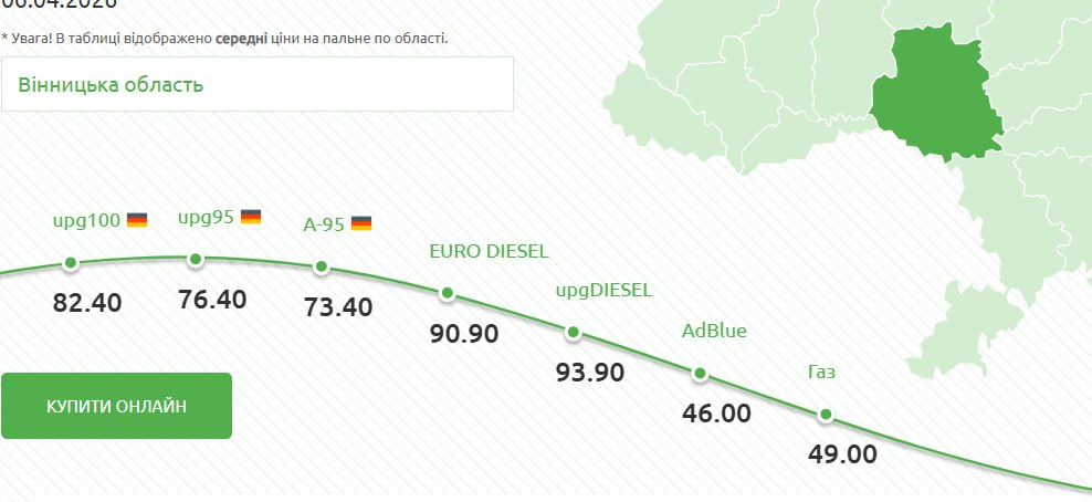 Середні ціни на пальне по Вінницькій області станом на 6 квітня 2026 року в мережі UPG