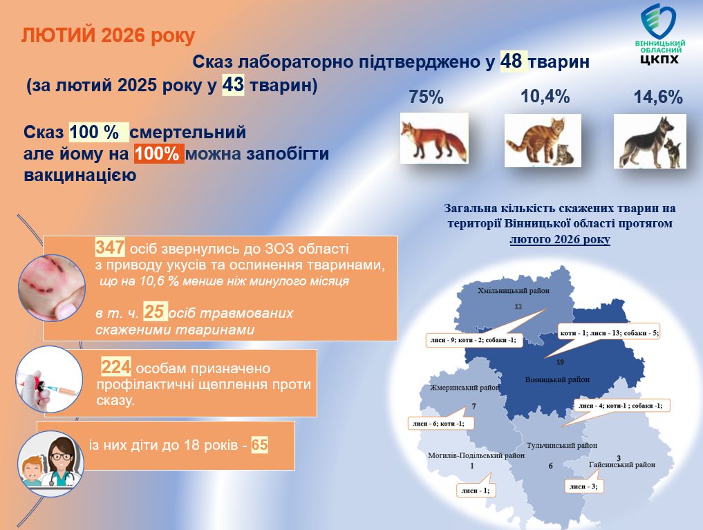 У лютому 2026 року на території Вінницької області лабораторно підтвердили 48 випадків сказу серед тварин, що на 11,6% більше, ніж за аналогічний період минулого року. Про це повідомляють Вінницький обласний центр контролю та профілактики хвороб і ГУ Держпродспоживслужби у Вінницькій області.