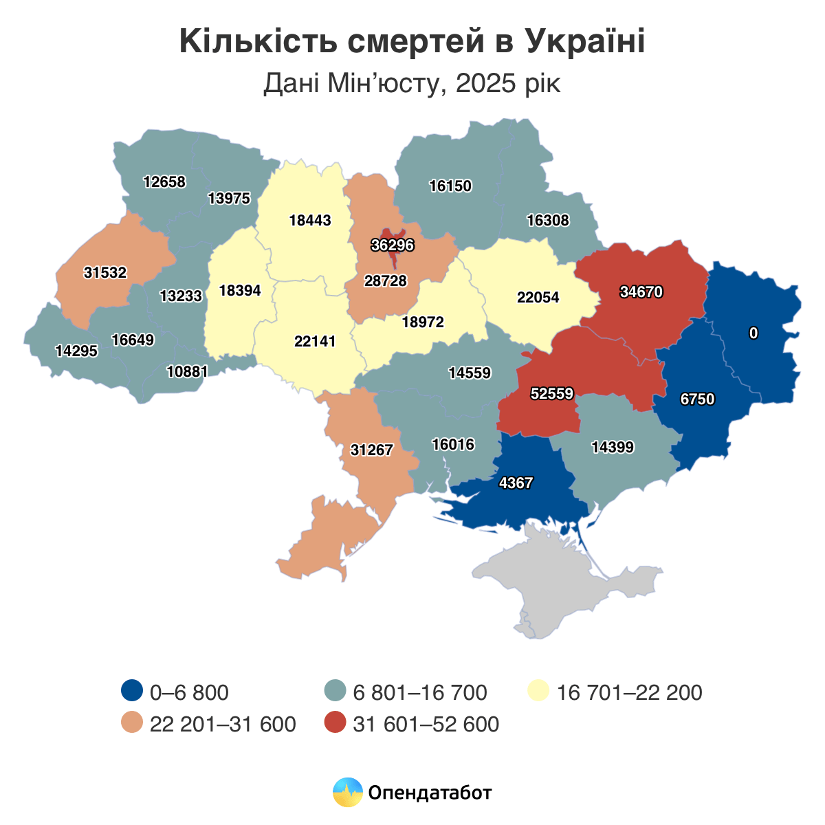 У 2025 році загальноукраїнський рівень смертності скоротився приблизно на 2%. Найбільше втрат зазнала Дніпропетровська область — понад 52 тисячі смертей. У столиці, навпаки, смертність зросла ще на 2%.