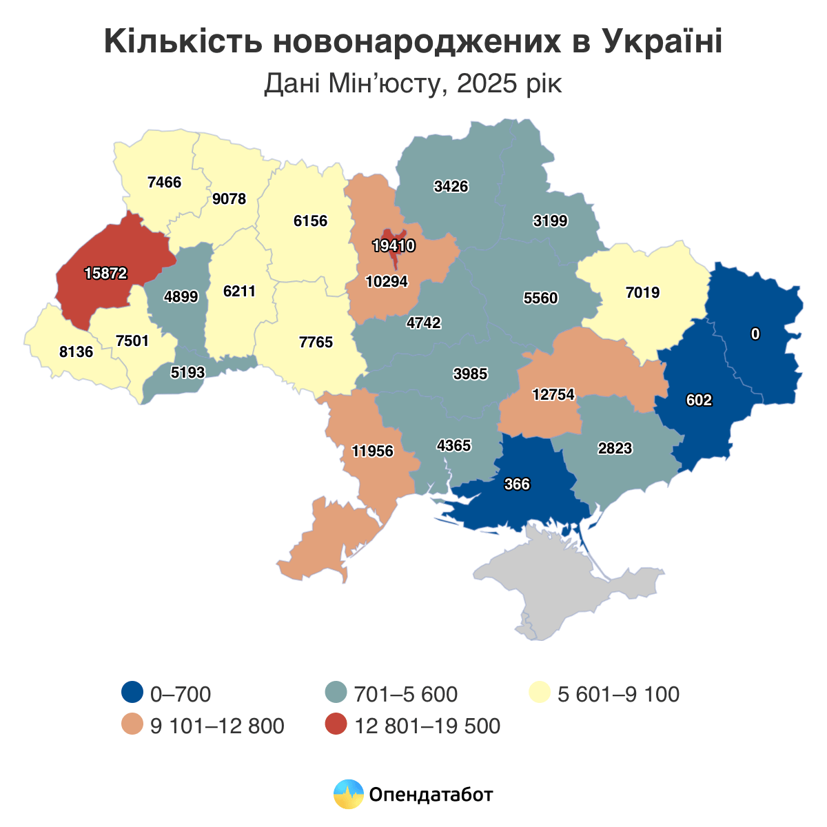 По всій країні у 2025 році було зареєстровано 168 778 новонароджених. Це значно менше, ніж у довоєнні роки: у порівнянні з 2021-м народжуваність скоротилася у 1,6 раза.