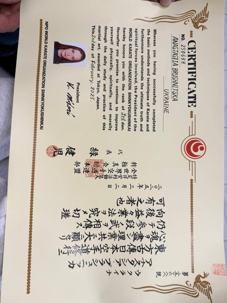 Тренерка та керівниця ладижинського спортивного клубу “Сіндо” Анастасія Брушніцька отримала особливе визнання — іменний сертифікат і чорний пояс третього дану, що надійшли безпосередньо з Японії, батьківщини карате кіокушинкай.