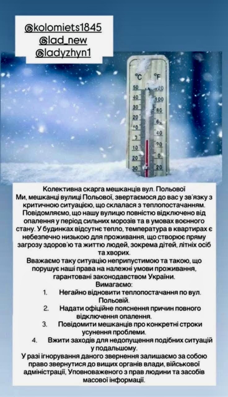 Нашу вулицю повністю відключено від опалення. У будинках відсутнє тепло, температура в квартирах є небезпечно низькою для проживання, що створює пряму загрозу здоровʼю та життю людей, зокрема дітей, літніх осіб та хворих“, — йдеться в колективній скарзі мешканців вулиці.