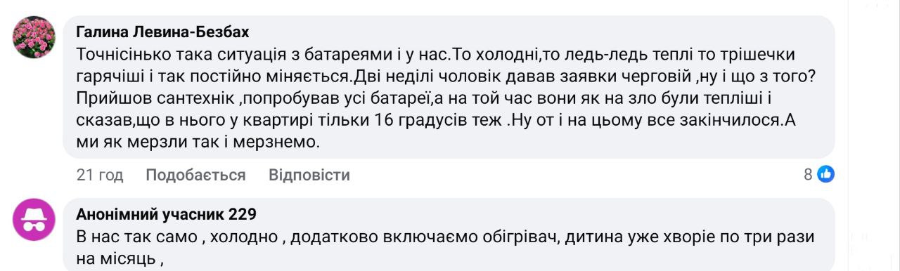 “Точнісінько така ситуація з батареями і у нас. Дві тижні чоловік давав заявки черговій — і що з того? Прийшов сантехнік, перевірив батареї, а вони тим часом були тепліші. І на цьому все закінчилося. А ми як мерзли, так і мерзнемо“, – пише Галина Левина-Безбах.