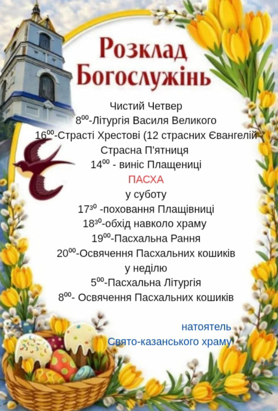 Пасхальне святкове Богослужіння. – 05.00 часи. 05.30 – Святкова Літургія.