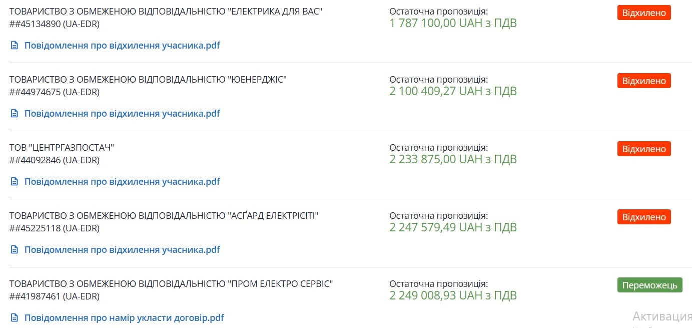 Тендер на закупівлю електричної енергії на суму понад два мільйони гривень було оголошено у грудні. У ньому взяли участь дев’ять компаній. Згідно з правилами закупівель, розглядається пропозиція з найменшою сумою (деталі тендера на Prozorro).