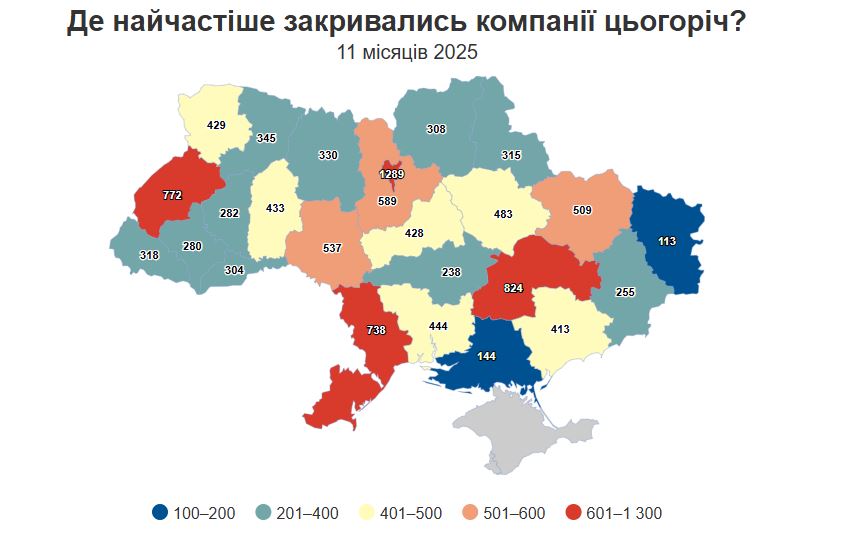 У регіональному розрізі основна частина закриттів сконцентрована у столиці, де зафіксовано 1 289 припинень діяльності. Вінницька область на цьому фоні показує стабільніший результат із показником у 428 ліквідованих компаній. Ця цифра є значно меншою за дані Дніпропетровщини чи Львівщини, де кількість закритих бізнесів перевищує сім сотень.