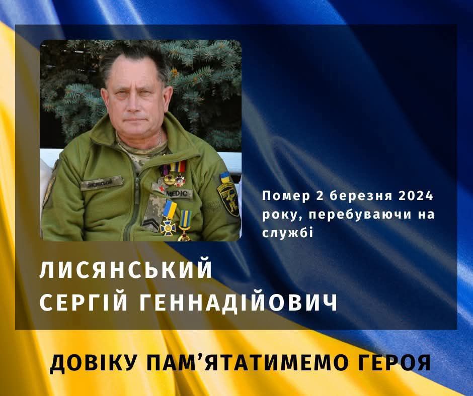 Сергій Лисянський народився 26 грудня 1964 року в селі Пальчик Шполянського району Черкаської області. У 1965 році його родина переїхала до Ладижина, де він здобув медичну освіту та присвятив життя порятунку людей. Сергій Геннадійович працював лікарем швидкої допомоги, педіатром і старшим бойовим медиком на фронті. Протягом служби в Збройних Силах України під час повномасштабного вторгнення він отримав численні нагороди, серед яких медаль «Почесна відзнака» та «Козацький Хрест». Серце героя зупинилося 2 березня 2024 року, залишивши пам’ять про відданого патріота у серцях рідних і громади.