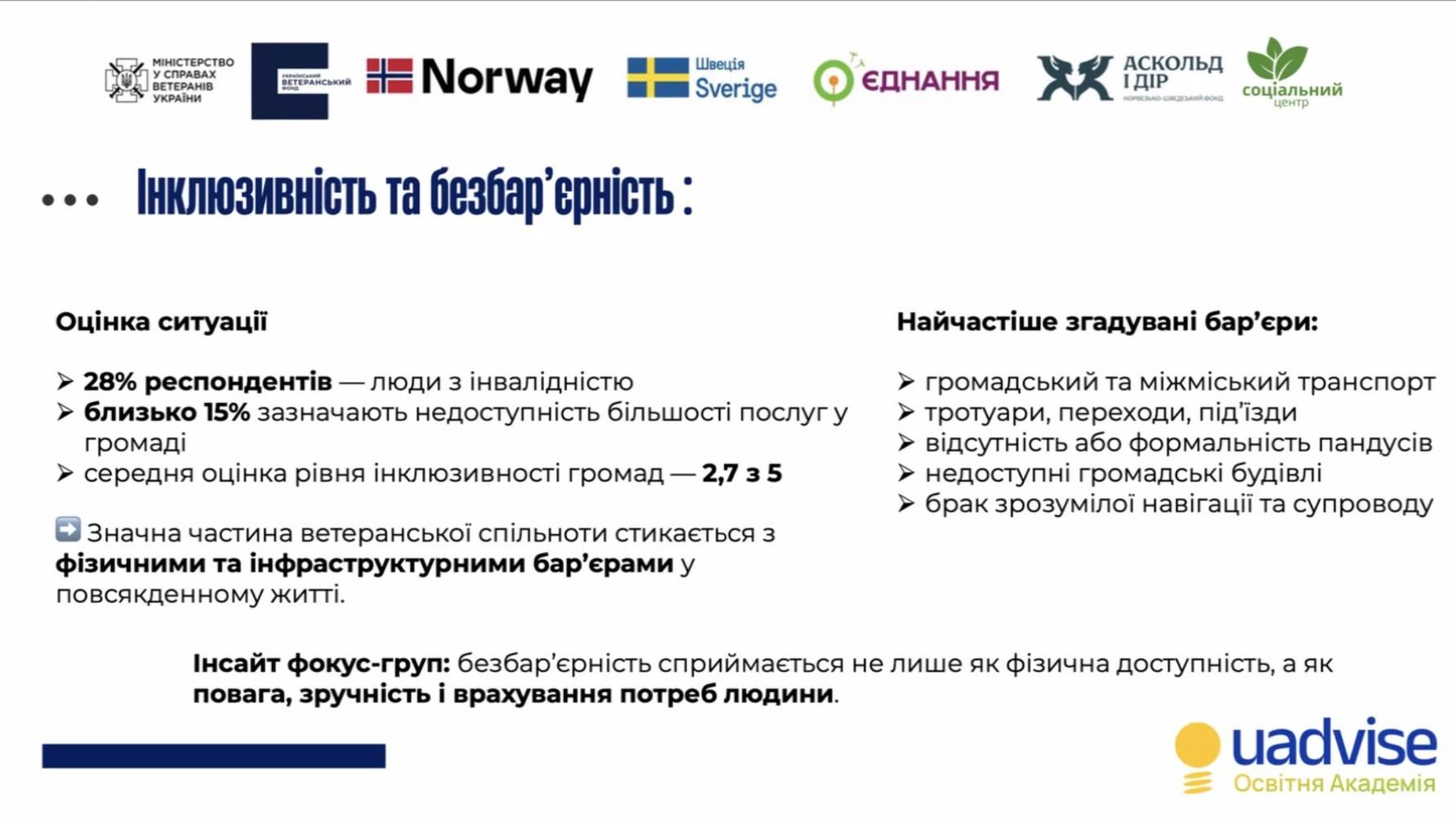 Близько 28% опитаних — люди з інвалідністю, однак доступність послуг у громадах залишається радше формальністю. Приблизно 15% респондентів заявляють, що більшість сервісів для них фактично недоступні, а середня оцінка інклюзивності громад становить 2,7 бала з 5.