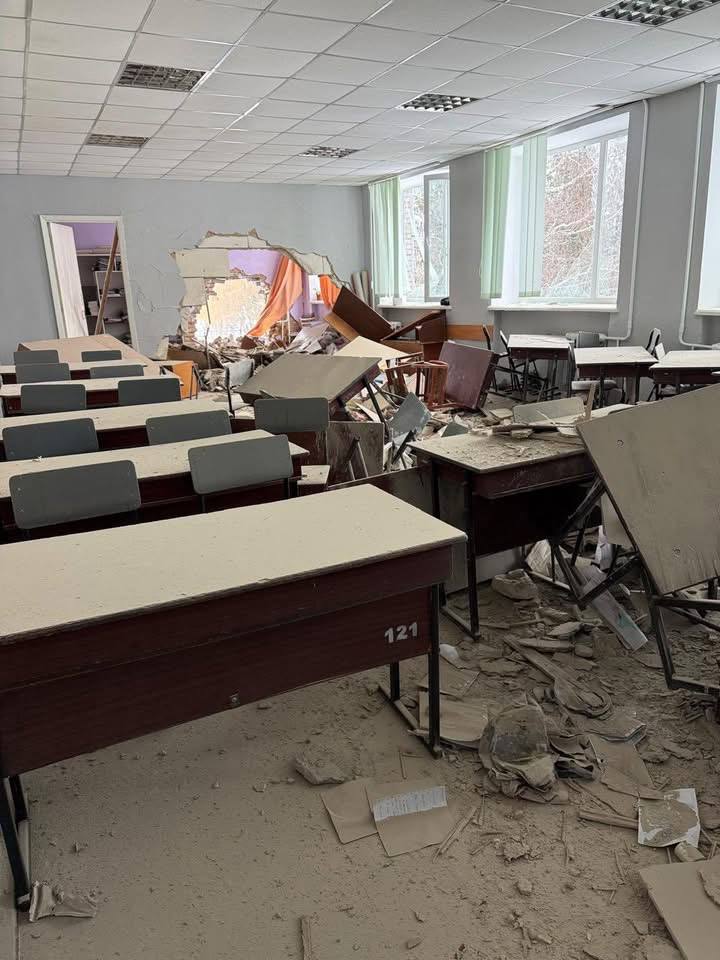 Дірка в стіні навчального корпусу, потрощені меблі, більше 150 вибитих вікон, двері.